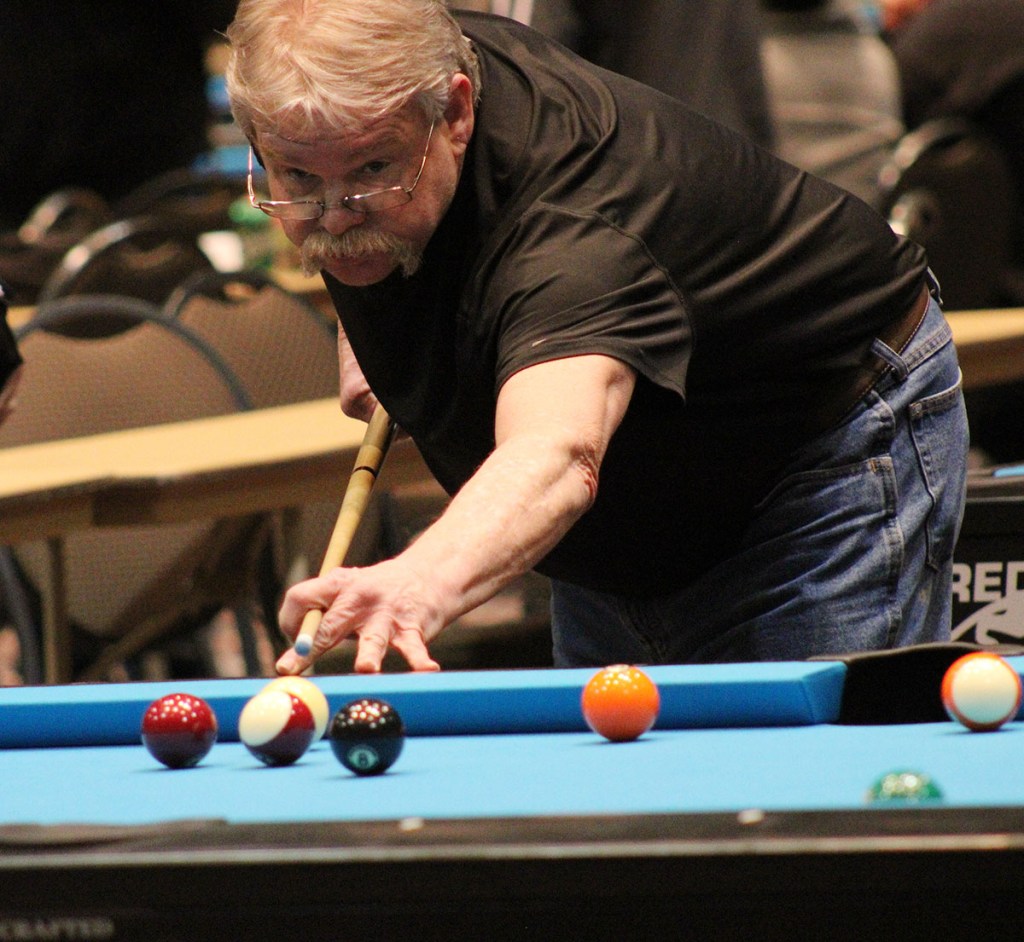 Fred Hinkle lines up for a shot on a striped ball in his match against High Voltage’s Wayne Reynolds, part of the State championship.