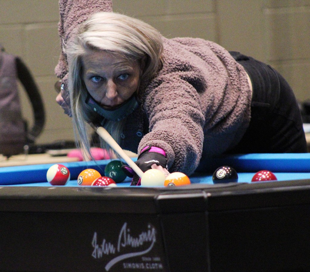 Sarah Johnson, a Skill Level 2 for High Voltage, aims for the 9-Ball in the final match part of the State championship.