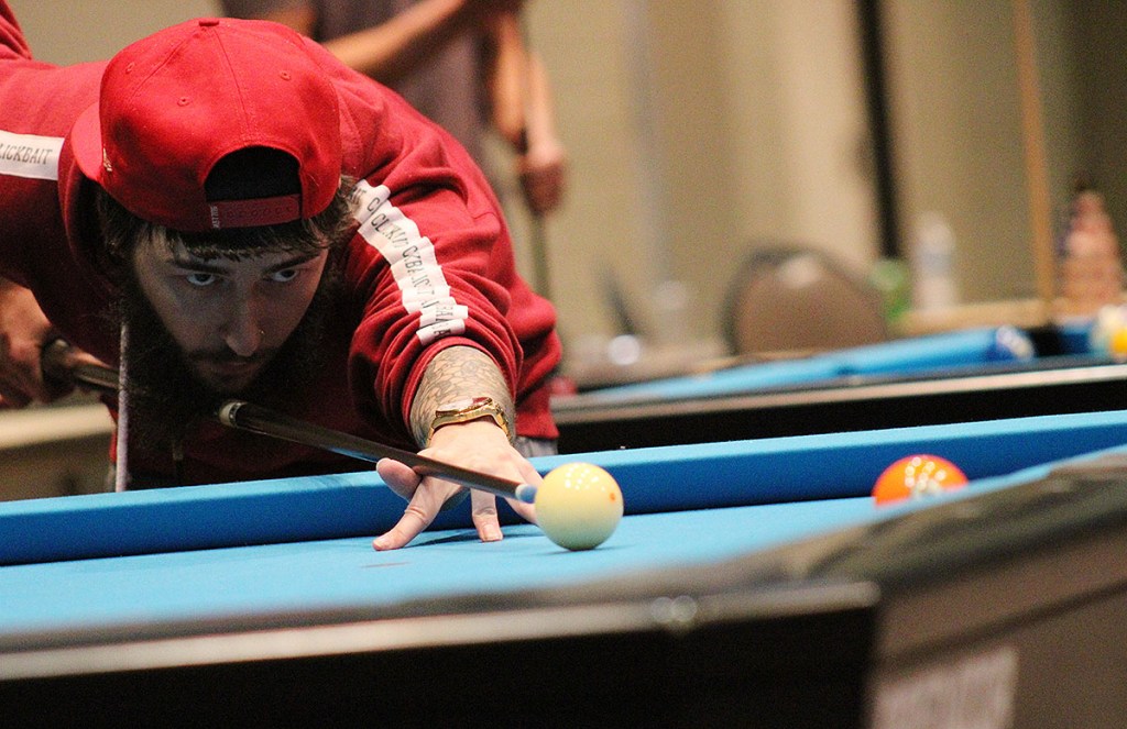 Anthony Roy, a Skill Level 5 for Miss Cues & Tattoos, lines up his shot in his match in the State championship against High Voltage’s Mike Watts. Roy made the game winning shot and won the championship.
