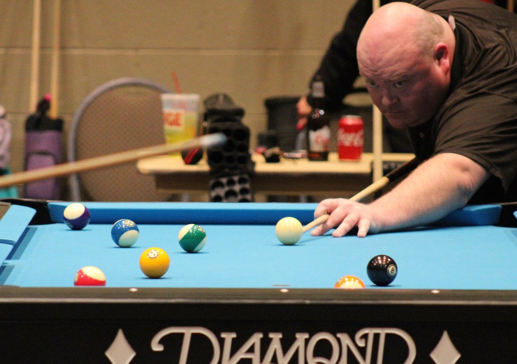 Mike Rizzuto, a Skill Level 6 for High Voltage, aims for the 1-Ball in his match against Miss Cues & Tattoos’ Brian Hinkle.